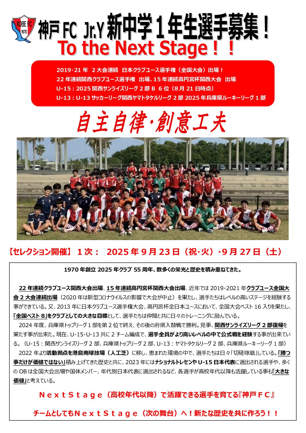 神戸FCジュニアユースは「自主自律・創意工夫」「To the Next Stage」を合言葉に個々のレベルアップを図り、チームとしては「全国ベスト8」を大きな目標に、選手達は日々高いレベルで切磋琢磨しています。